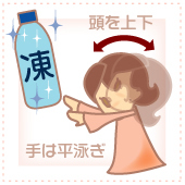 - 平泳ぎをするように腕を回し、首を上下に動かします。